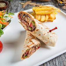 Tortilla ekmeğinde, kaşar peyniri, köfte, soğan, renkli biber, yeşillik, domates, mantar, patates kızartması.